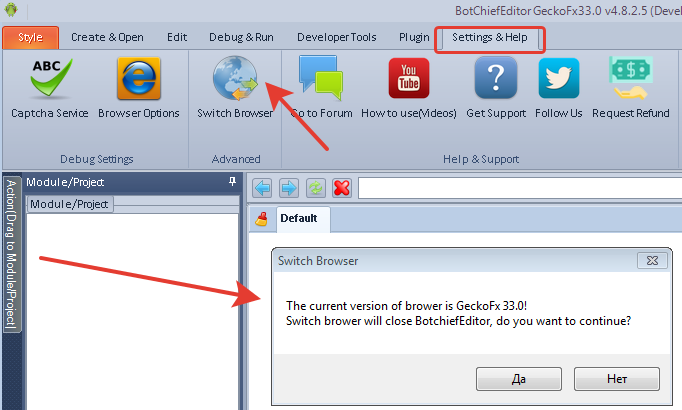I will tell you why this is happening. Due to the fact that the BotChief editor supports several versions of the GeckoFx engine, plus the chrome engine. The latest version of the gecko 65 engine is under development, an update is promised in the near future.