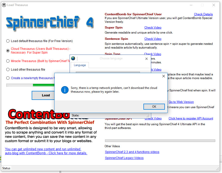I just purchased SpinnerChief 4 Ultimate Version today but I can't download any thesaurus inside the software as it always shows the error message: "Temp network problem, please try again later."