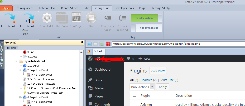 In using BotChief developer and I have noted that it is a nice editor, and there a action that can greatly improve efficiency of debugging scripts, I would like to automatically move to the next instruction after running a step. This would reduce the process of manual debugging to one mouse click per step and without a mouse move or extra clicks. I am sure that when you think about it that this will improve productivity for developer by being able to focus only on the debug window and avoid losing focus by having the select the next step. You can see the mock up I have put in the menu. I feel this would make the debugger more enjoyable to use. Thanks in advance.