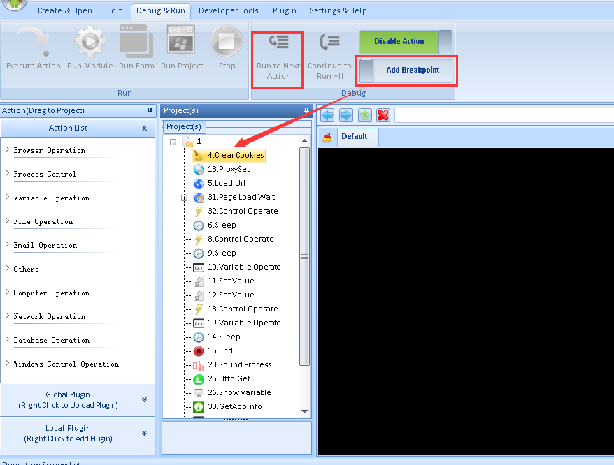 Hi, very thanks for your suggestion. Actually we have this similar function. If you want to test the actions one by one, you can Add Breakpoint for your first action, and then click the Run to Next Action, it will run the next actions one by one.